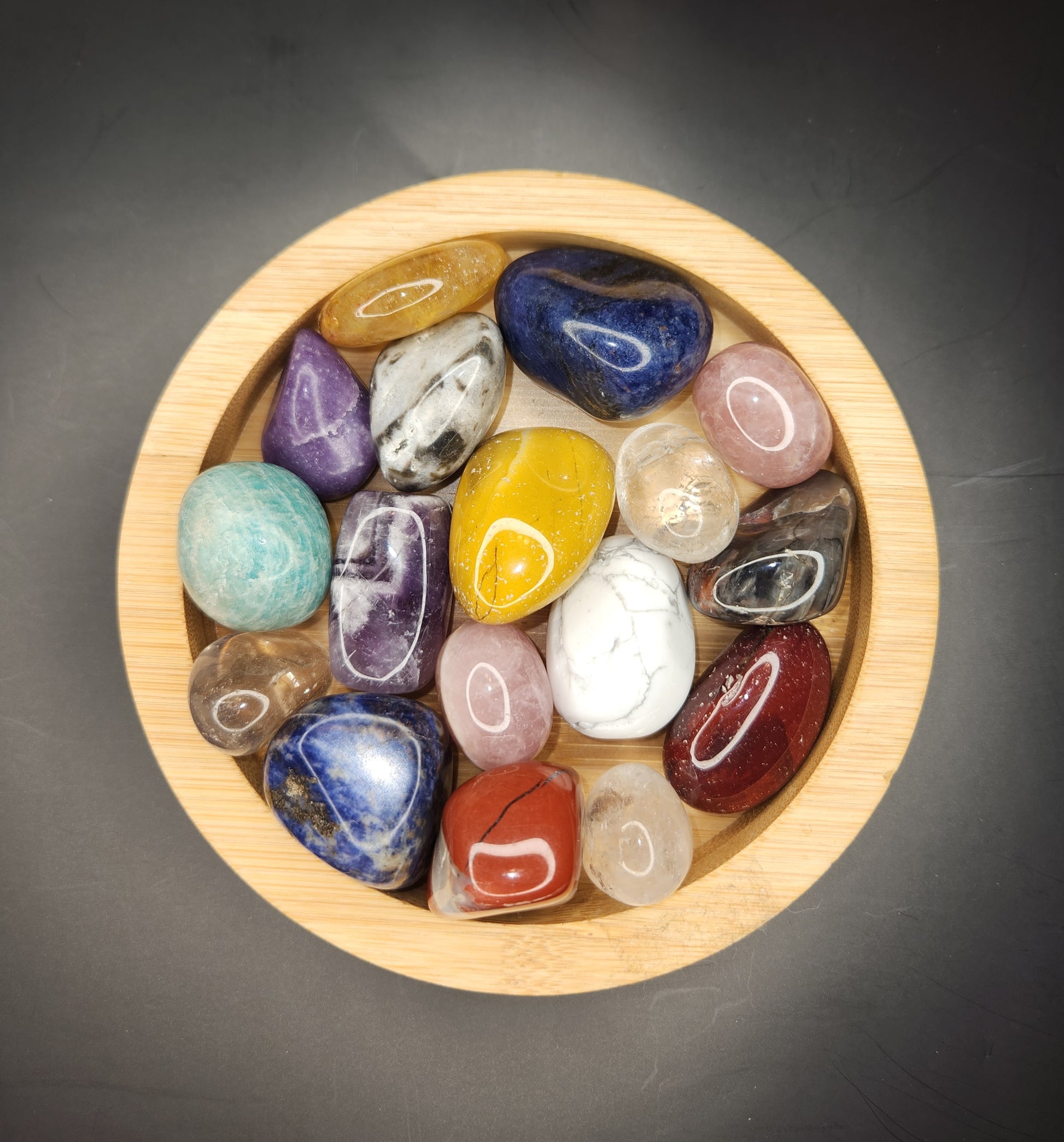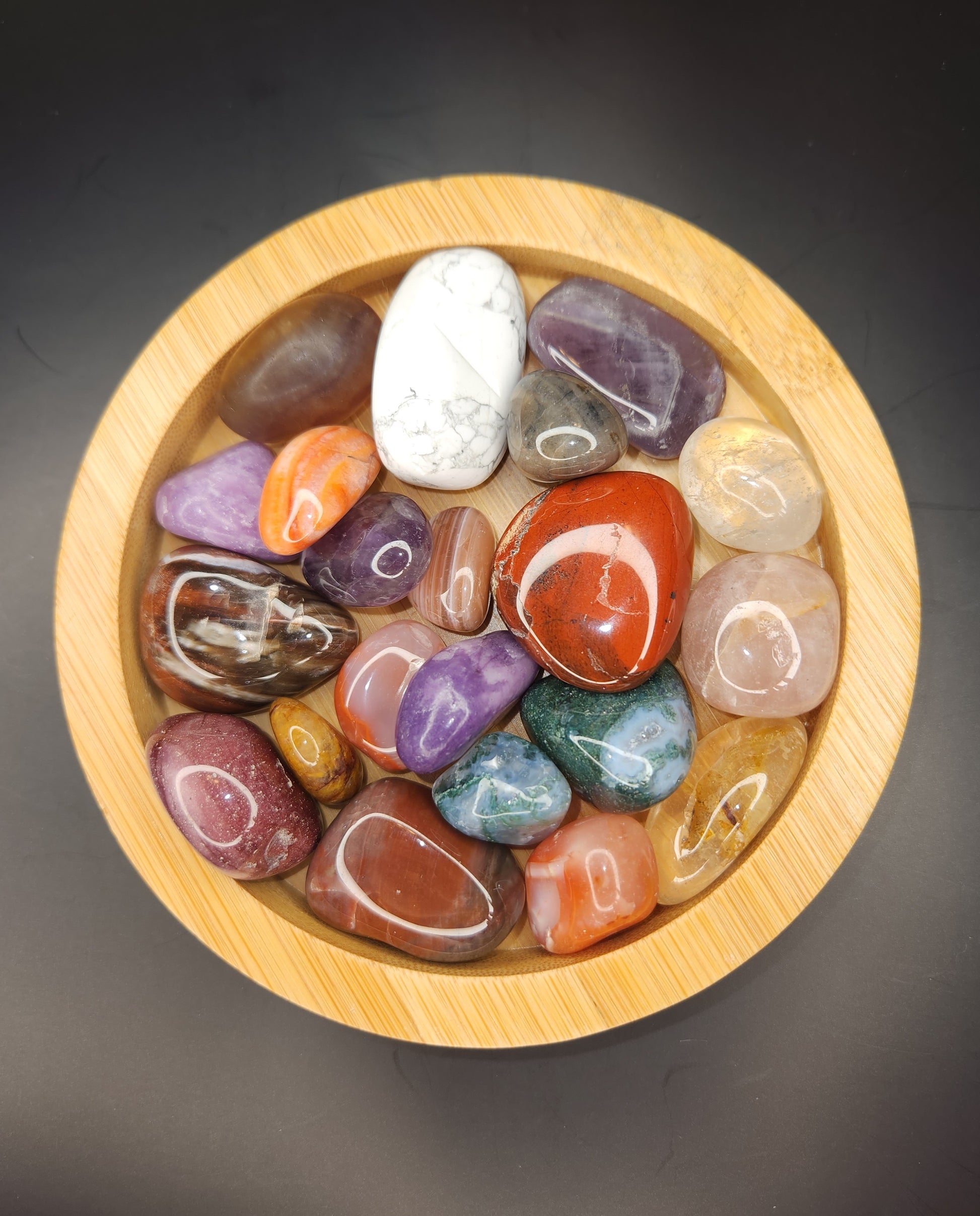 Intuitively chosen tumbles may include: amethyst, amazonite, obsidian, rose quartz, moss agate, red jasper, sodalite, red vein jasper, lepidolite, black moonstone, UV reactive sodalite, and more!